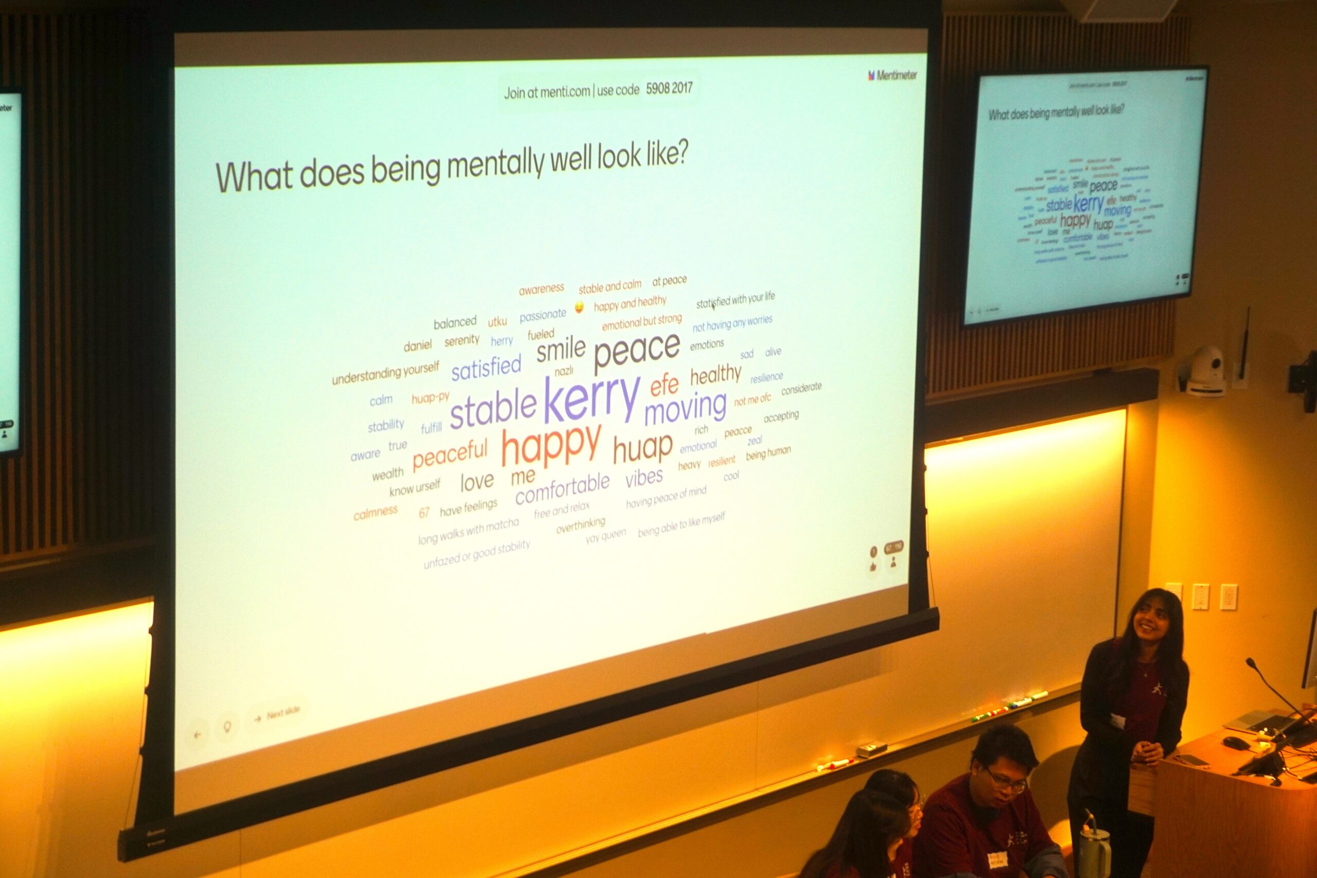 Student responses were shared through a live Mentimeter word cloud, and for many, being mentally well meant ‘feeling peaceful,’ to ‘feeling alive’ to ‘being able to like myself’ to ‘health and stability,’ and more. These responses reflected both their unique backgrounds and shared hopes.